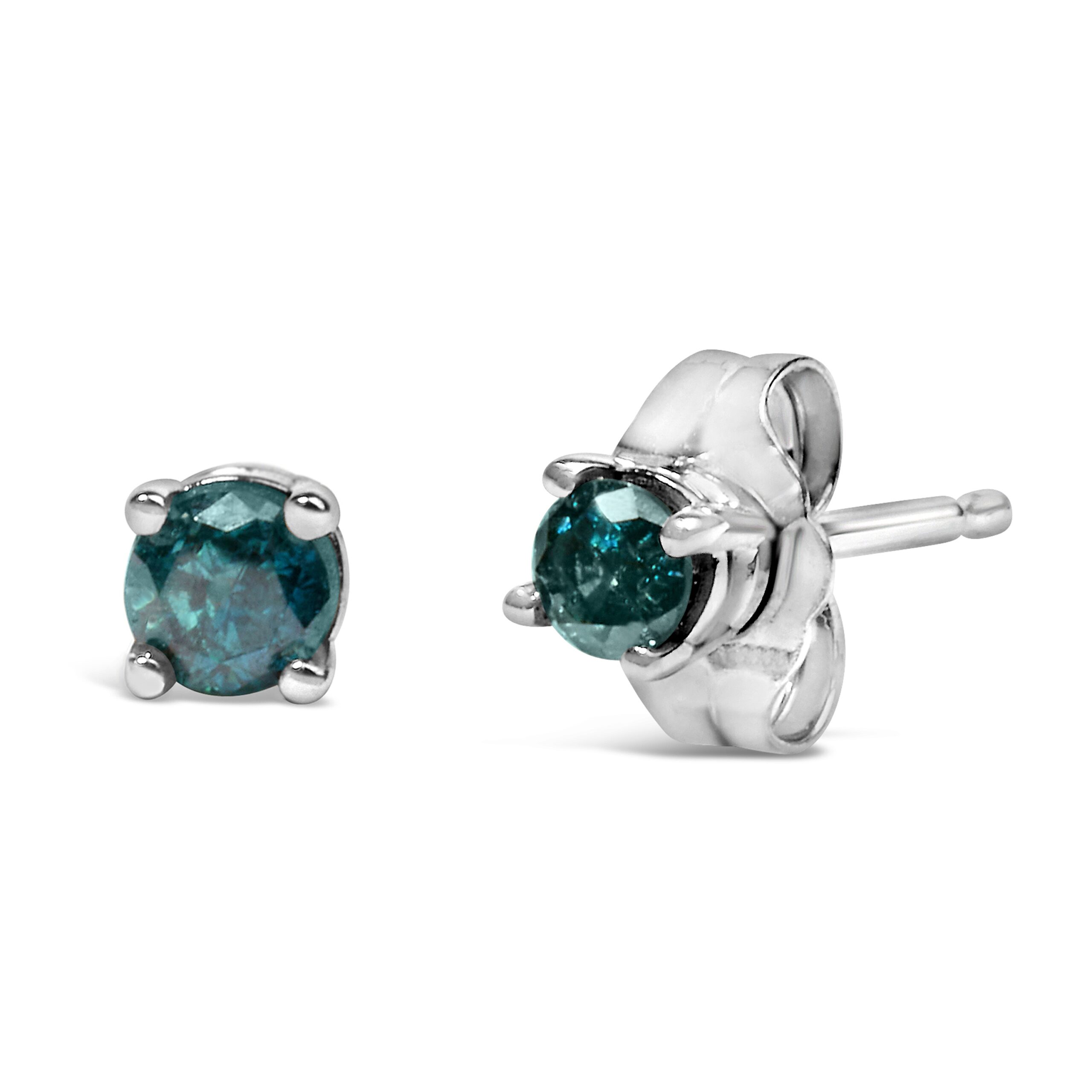 Celebrate any occasion with these classic shimmering solitaire diamond stud earrings. Fashioned in genuine .925 sterling silver, each earring showcases a sparkling color treated round cut diamond solitaire. They come in a sophisticated fancy blue color. Dazzling with a bright polished shine, these post earrings secure comfortably with friction posts and butterfly backs. These classic earrings make a great gift for any special occasion! Whether worn for daytime glamour or evening sparkle, these studs are gorgeously versatile. Coordinate these earrings with your favorite diamond necklace or other diamond jewelry to create a complete elegant ensemble.