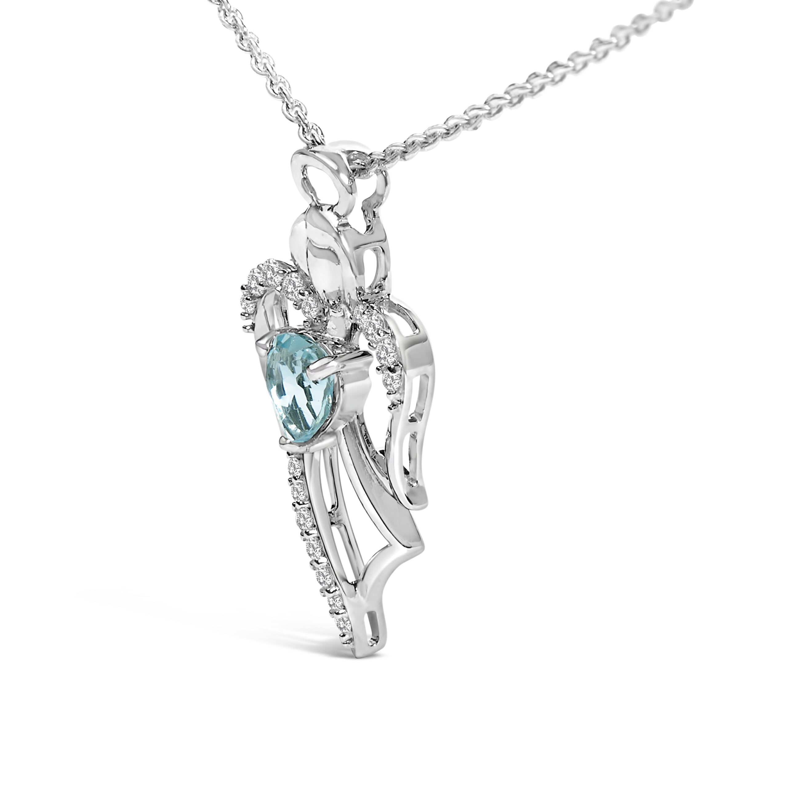 This exquisite angel pendant necklace, expertly crafted from .925 sterling silver, captures the essence of ethereal beauty and timeless elegance. At its heart, a lab-created blue topaz, shaped like a pristine heart and treated to enhance its mesmerizing azure hue, gleams from a secure three-prong setting. Surrounding it, natural white sapphires, each placed with precision in a shared prong setting, mimic the stars in the night sky, adding a celestial sparkle to the angelic figure. Attached to an 18-inch festooned cable chain with a sturdy lobster claw clasp, this piece is not only a stunner but promises enduring security and comfort. Perfect for those who cherish angelic symbolism or seek a touch of divine grace in their accessories, it is a beacon of craftsmanship and style.