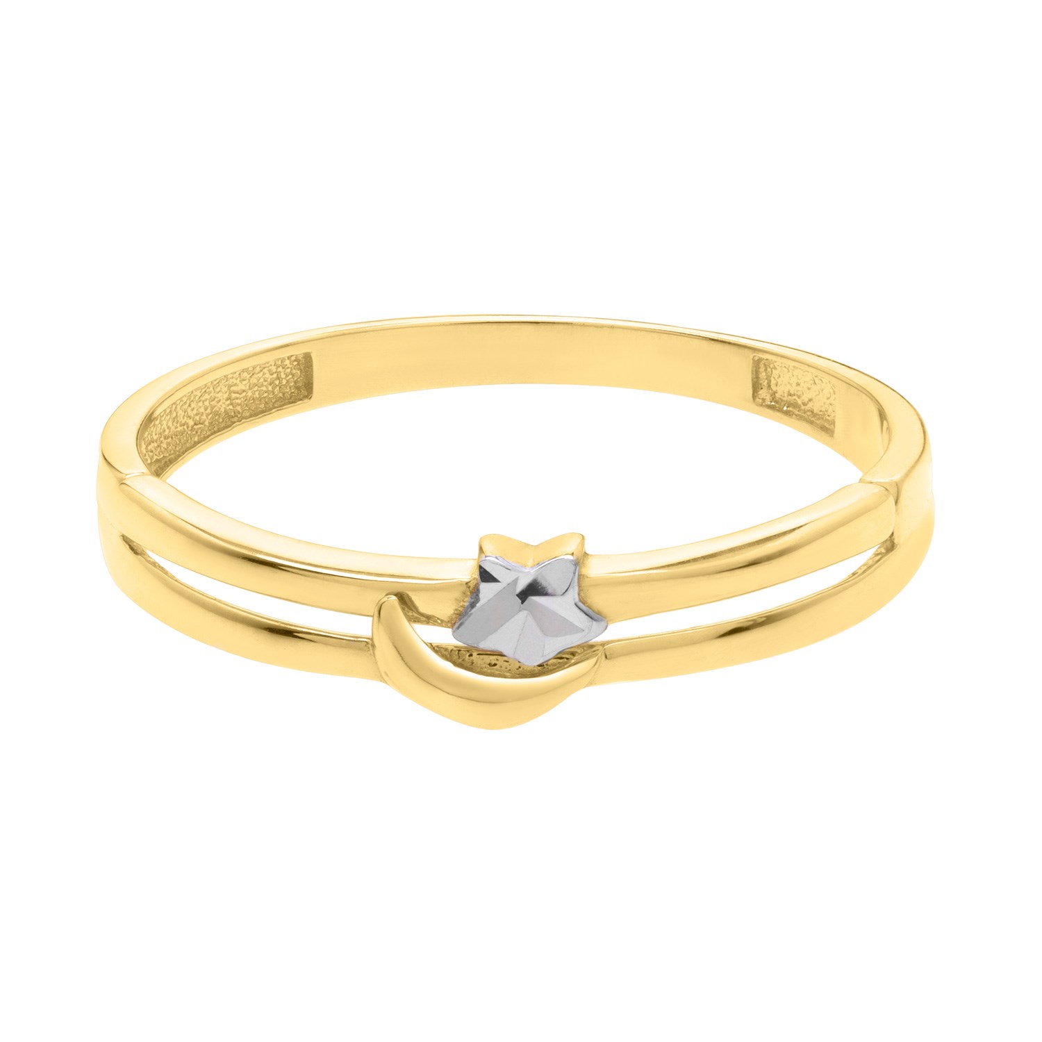 This 10k two-tone gold ring features a delicate star and moon motif, enhanced by a diamond-cut and polished finish. Cutout details behind the celestial shapes add a sense of depth and an ethereal quality to the design. A precious accessory, it’s perfect for those inspired by the mystery and wonder of the night sky.