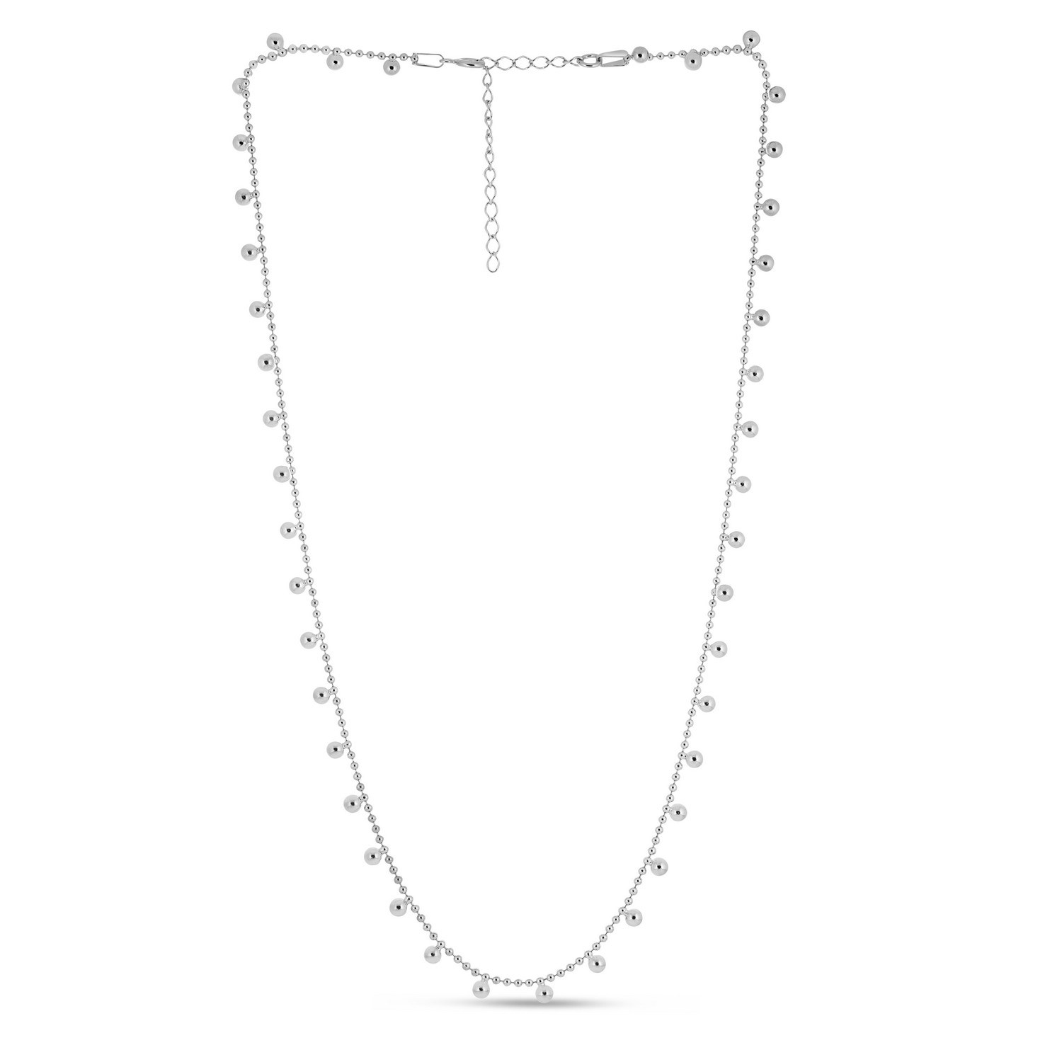 Elevate your everyday style with this Sterling Silver Rhodium Plated Bead Necklace. Featuring polished silver beads and a sleek rhodium finish, it offers timeless shine and simple elegance. Perfect for layering or wearing solo for a classic, refined look.