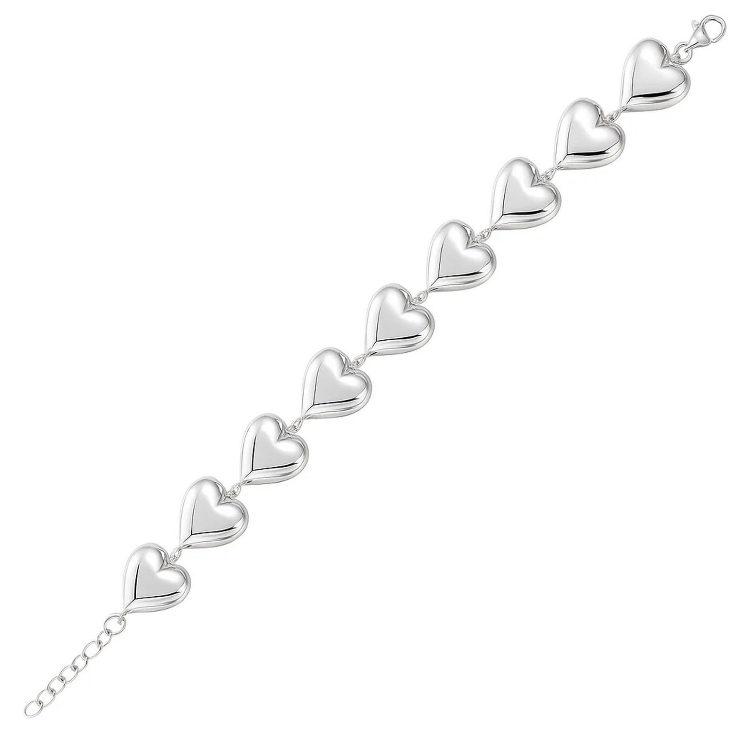 This sterling silver rhodium plated puffed heart bracelet features a polished, dimensional heart charm on a sleek, shining chain. Its bright, modern finish and romantic design make it perfect for everyday wear, thoughtful gifting, or layering with your favorite pieces.