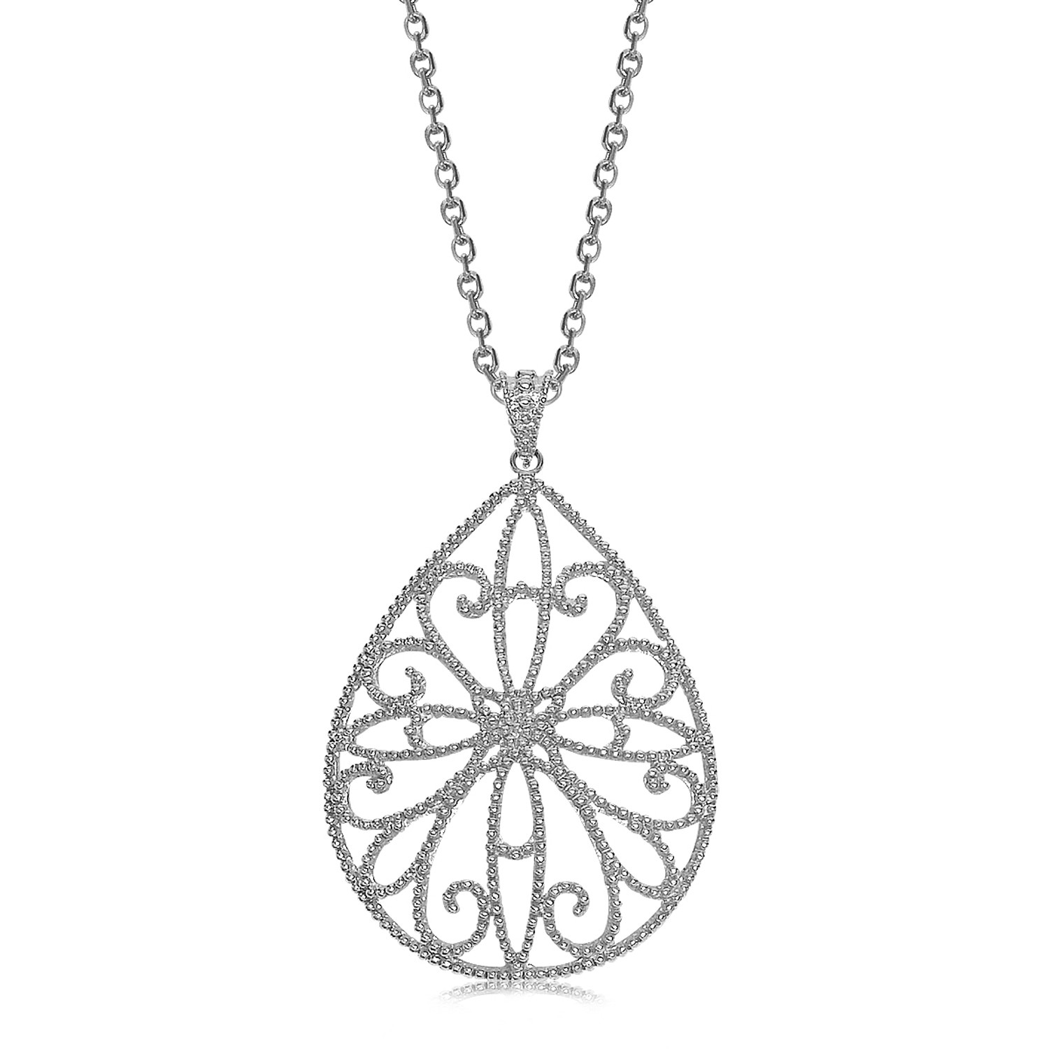 Showcasing exquisite scrollwork elements, this teardrop shape pendant is a lovely filigree piece. Crafted in sterling silver with rhodium plating and hangs from a fancy bail.