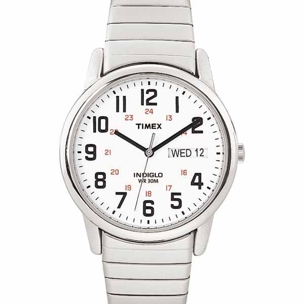 Stainless Steel Case, Mens Fashion Easy Reader with large easy to read numbers, Indiglo night light, Day and date display at 3 O’Clock, Stainless Steel Expansion Bracelet