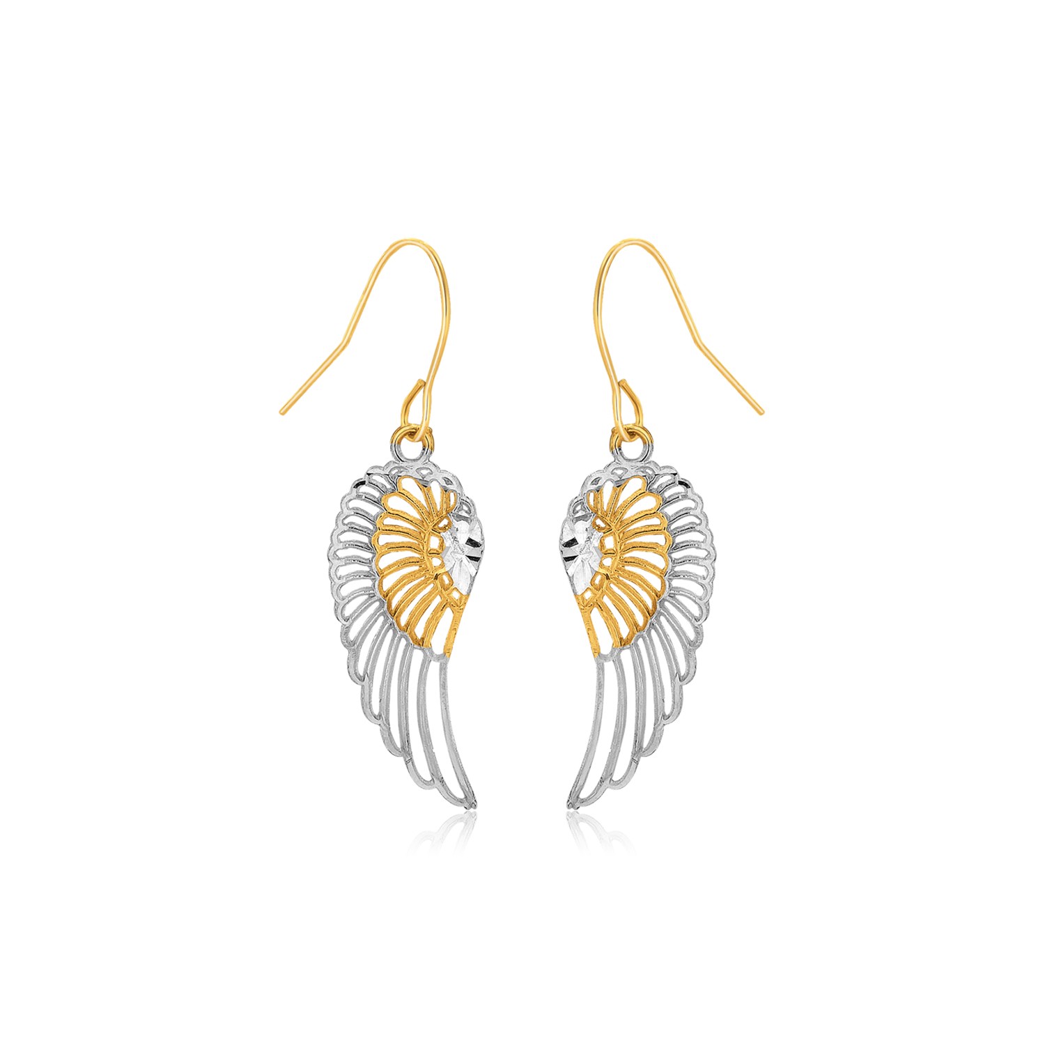 Two-tone drop earrings crafted in 10K gold featuring an intricate wing design and secured with a french wire backing.
